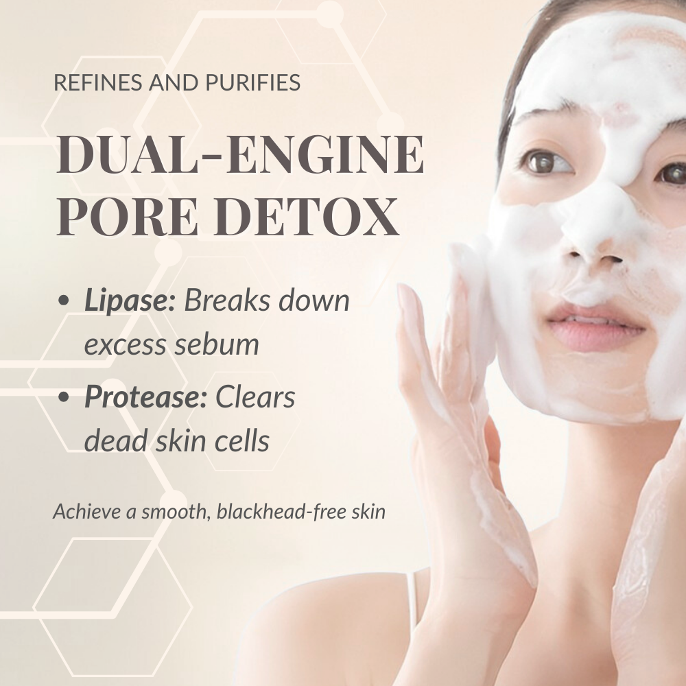 We utilize a synergistic blend of Lipase to break down your oxidized sebum and Protease to digest dead skin cells, giving you a superior "biological deep clean." We designed this double-action system to target deep-pore impurities without physical abrasion, so you achieve a refined, blackhead-free texture without the risk of micro-tears.